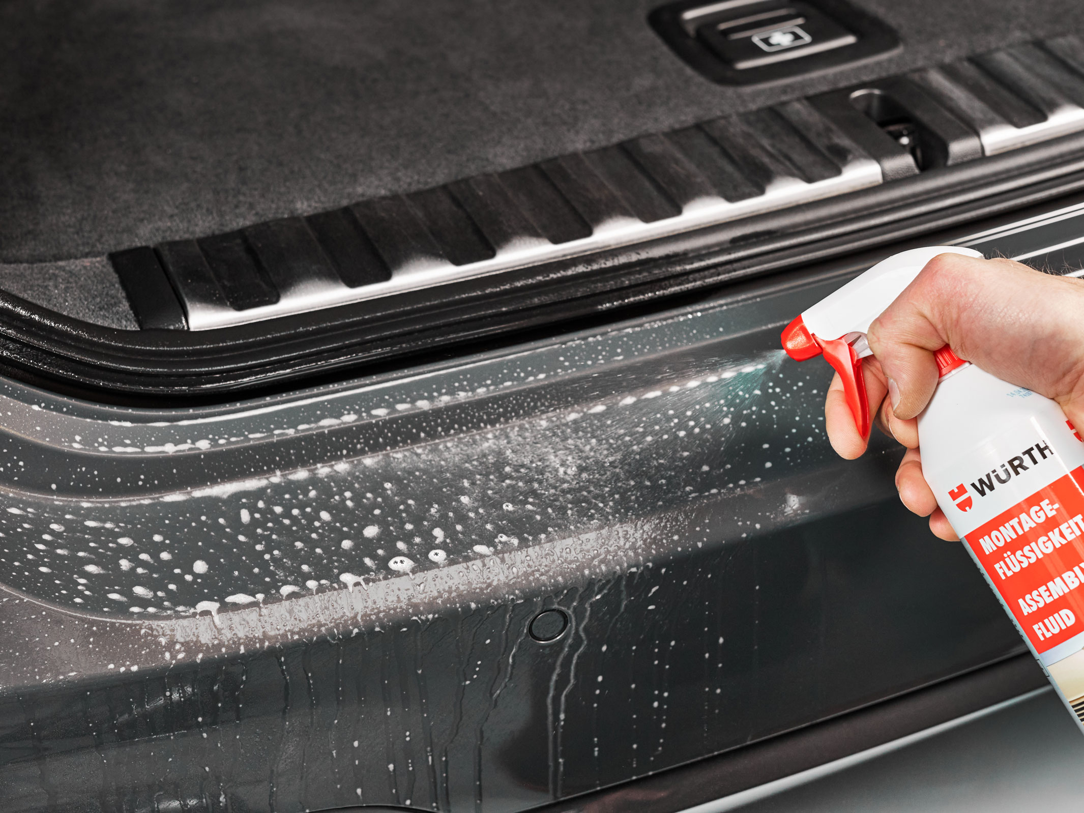 - Folienklebeseite und zu beklebende Lackfläche mit Würth-Montageflüssigkeit reichlich benetzen (als Montageflüssigkeit können alternativ auch 500 ml Wasser + ca. 1-2 Spritzer Spülmittel gemischt werden)