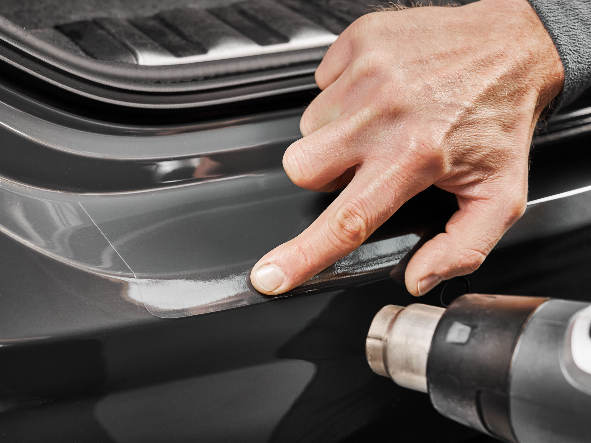 - anschließend mit dem Finger die Folie langsam um die Kante streichen (von oben nach unten) bei Wölbungen, bzw. Radien bitte den Fön zur Hand nehmen und die Folie leicht erwärmen (achten Sie darauf, nicht zu überhitzen, um Ihrem Fahrzeuglack nicht zu schaden)